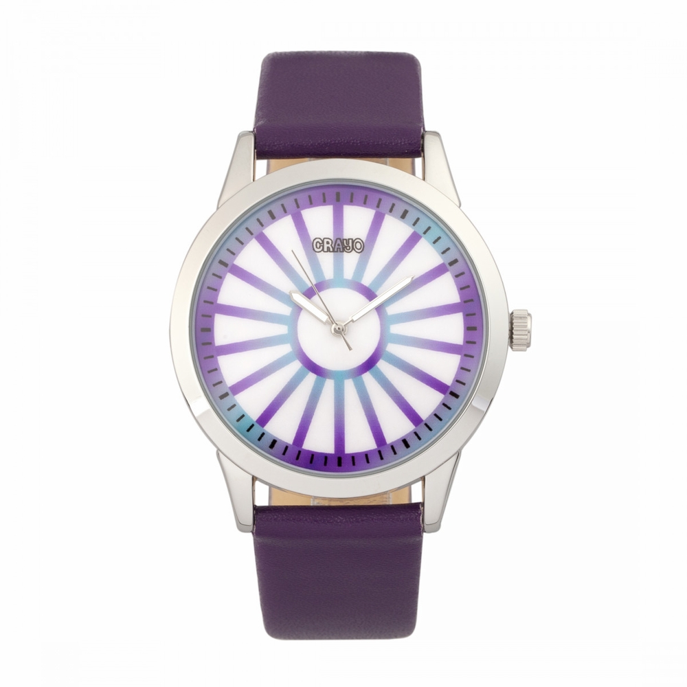 Silver-tone alloy case with a purple leather strap. Fixed silver-tone alloy bezel. Multicolor dial with silver-tone hands and index hour markers. Minute markers around the outer rim. Dial Type: Analog. Luminescent hands. Quartz movement. Scratch resistant mineral crystal. Pull / push crown. Solid case back. Round case shape, case size: 41 mm, case thickness: 10 mm. Band width: 20 mm. Buckle clasp. Water resistant at 30 meters / 100 feet. Functions: hour, minute, second. Casual watch style. Watch label: Japan Movt. Crayo Electric Watch CRACR5006.