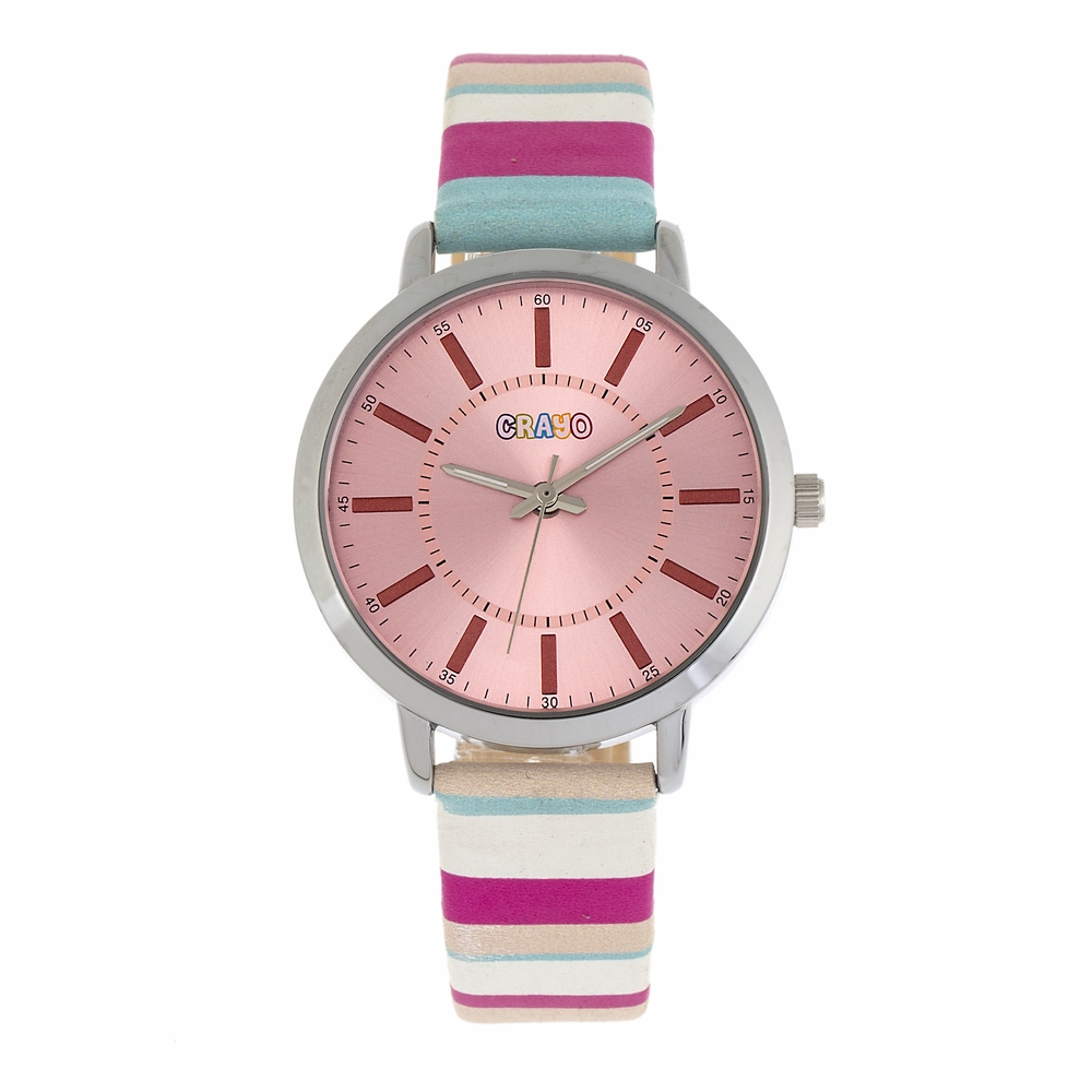 Silver-tone alloy case with a beige leatherette strap. Fixed silver-tone alloy bezel. Pink dial with silver-tone hands and index hour markers. Minute markers around the outer rim. Dial Type: Analog. Luminescent hands and markers. Quartz movement. Scratch resistant mineral crystal. Pull / push crown. Solid case back. Round case shape, case size: 36 mm, case thickness: 9 mm. Band width: 16 mm. Buckle clasp. Water resistant at 30 meters / 100 feet. Functions: hour, minute, second. Casual watch style. Watch label: Japan Movt. Crayo Swing Quartz Pink Dial Unisex Watch CRACR5705.