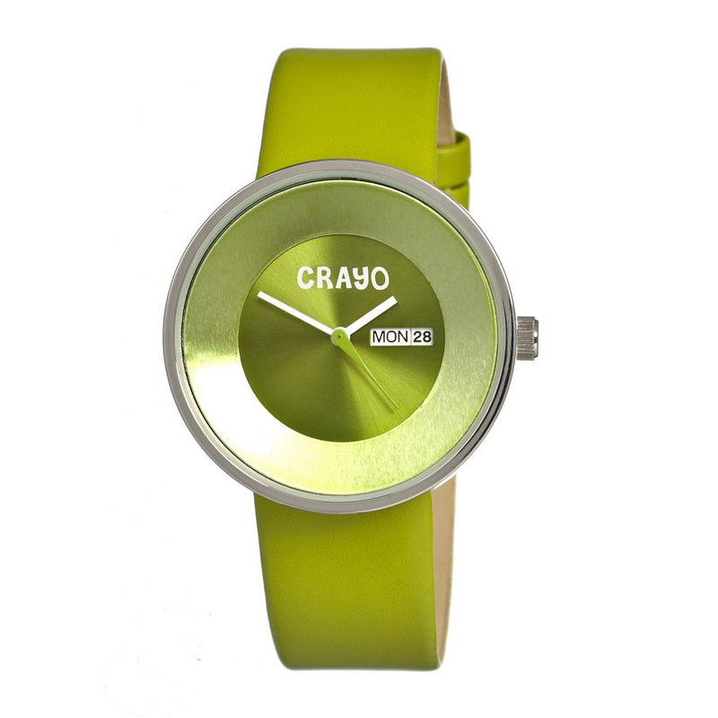 Silver-tone stainless steel case with a green leather strap. Fixed silver-tone bezel. Green dial with white hands. No markers. Dial Type: Analog. Day of the week and date display at the 3 o'clock position. Quartz movement. Scratch resistant mineral crystal. Pull / push crown. Solid case back. Case diameter: 40 mm. Case thickness: 9 mm. Round case shape. Band width: 20 mm. Tang clasp. Water resistant at 30 meters / 100 feet. Functions: date, day, hour, minute, second. Casual watch style. Crayo Button Silver-tone Stainless Steel Case Unisex Watch CR0203.