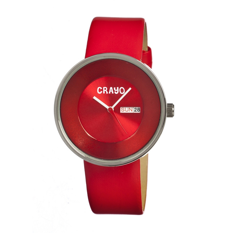 Silver-tone stainless steel case with a red leather strap. Fixed silver-tone bezel. Red dial with white hands. No markers. Dial Type: Analog. Day of the week and date display at 3 o'clock position. Quartz movement. Scratch resistant mineral crystal. Pull / push crown. Solid case back. Case diameter: 40 mm. Case thickness: 9 mm. Round case shape. Band width: 20 mm. Tang clasp. Water resistant at 30 meters / 100 feet. Functions: date, day, hour, minute, second. Casual watch style. Crayo Button Silver-tone Stainless Steel Case Unisex Watch CR0206.