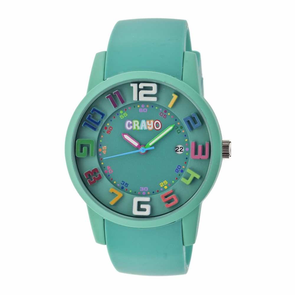 Teal rubber-coated metal case with a teal silicone strap. Fixed teal rubber-coated metal bezel. Teal dial with luminous green and red hands and multi-colored (3D raised) Arabic numeral hour markers. Minute markers around an inner ring. Dial Type: Analog. Luminescent hands and markers. Date display at the 3 o'clock position. Quartz movement. Scratch resistant mineral crystal. Pull / push crown. Solid case back. Case diameter: 41 mm. Case thickness: 11 mm. Round case shape. Band width: 17 mm. Tang clasp. Water resistant at 20 meters / 66 feet. Functions: date, hour, minute, second. Casual watch style. Crayo Festival Teal Dial Teal Silicone Unisex Watch CR2003.