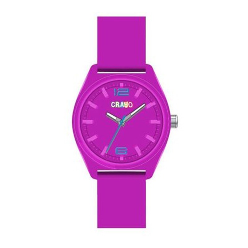 Purple metal case with a purple leatherette strap. Fixed purple bezel. Purple dial with grey hands and Arabic numeral and index hour markers. Minute markers around the outer rim. Dial Type: Analog. Luminescent hands and markers. Quartz movement. Scratch resistant mineral crystal. Round case shape, case size: 36 mm, case thickness: 9 mm. Band width: 19 mm. Buckle clasp. Water resistant at 30 meters / 100 feet. Functions: hour, minute, second. Casual watch style. Watch label: Japan Movt. Crayo Dynamic Purple Dial Watch CR4806.