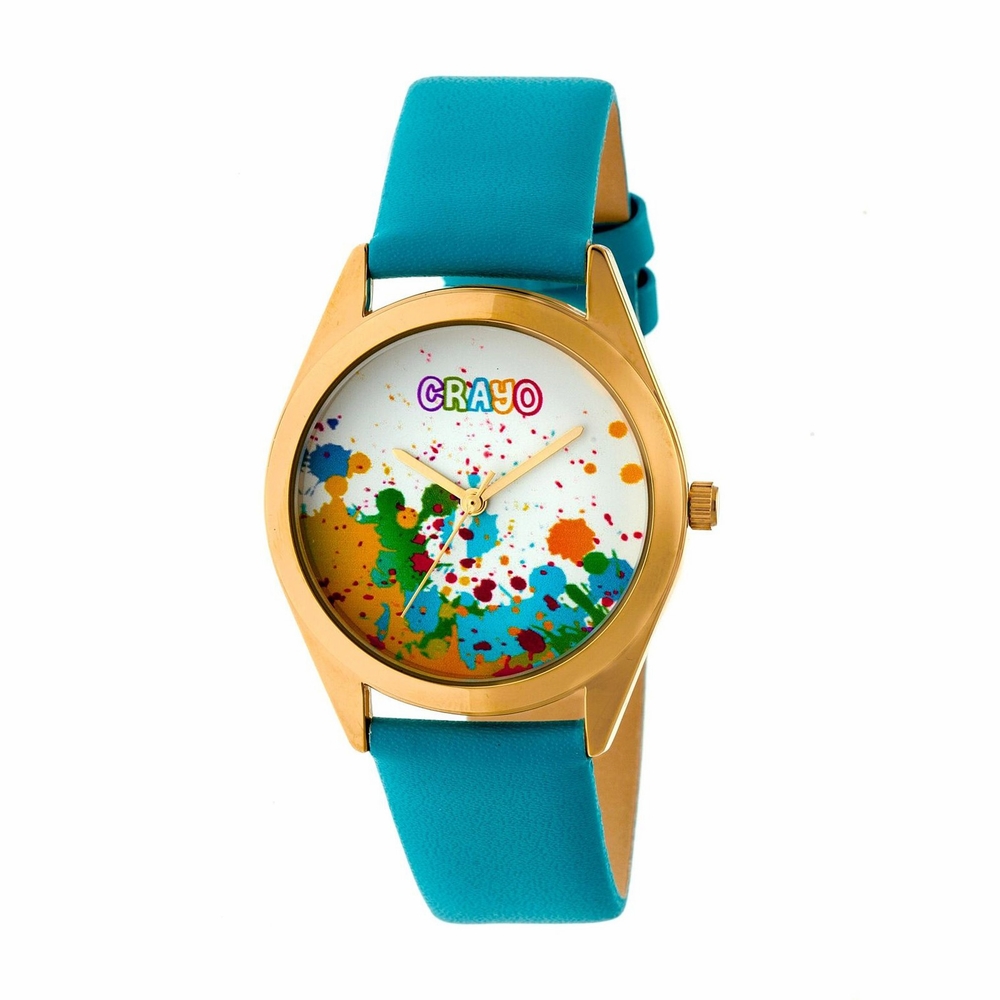 Gold-tone metal case with a powder blue leather strap. Fixed gold-tone bezel. Multicolor dial with gold-tone hands. Dial Type: Analog. Quartz movement. Scratch resistant mineral crystal. Solid case back. Round case shape, case size: 35 mm, case thickness: 8 mm. Band width: 18 mm. Buckle clasp. Water resistant at 30 meters / 100 feet. Functions: hour, minute, second. Casual watch style. Crayo Graffiti Watch CRACR4004.