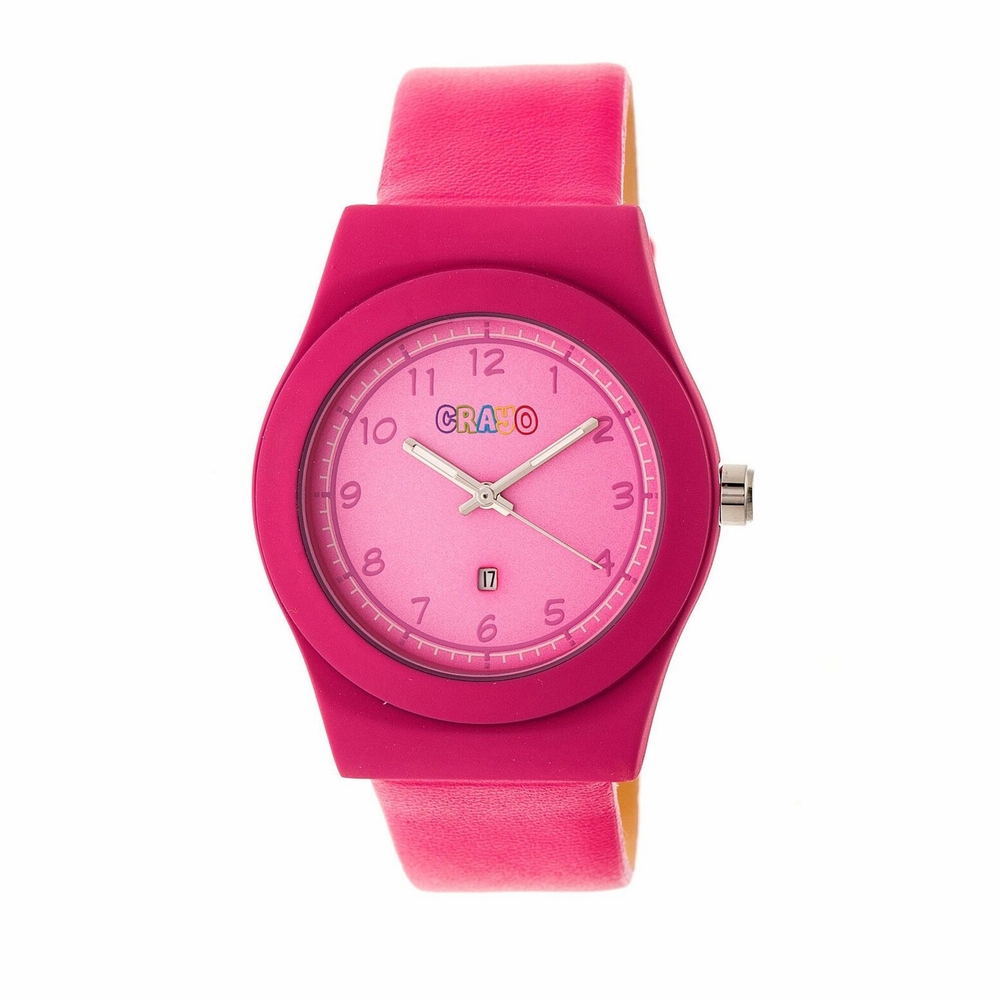Hot pink metal case with a hot pink leather strap. Fixed pink bezel. Hot pink dial with silver-tone hands and Arabic numeral hour markers. Minute markers around the outer rim. Dial Type: Analog. Luminescent hands. Date display at the 6 o'clock position. Quartz movement. Scratch resistant mineral crystal. Solid case back. Round case shape, case size: 37 mm, case thickness: 11 mm. Band width: 20 mm. Buckle clasp. Water resistant at 30 meters / 100 feet. Functions: date, hour, minute, second. Casual watch style. Crayo Dazzle Hot Pink Dial Ladies Watch CRACR4104.