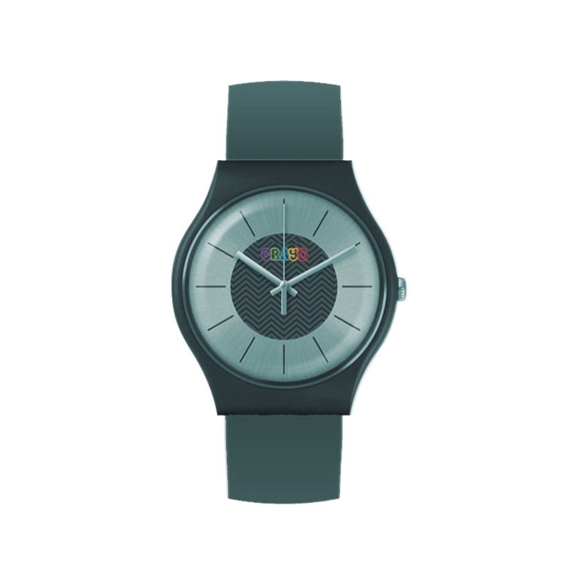 Green metal case with a green leatherette strap. Fixed green bezel. Green dial with silver-tone hands and index hour markers. Dial Type: Analog. Quartz movement. Scratch resistant mineral crystal. Round case shape, case size: 36 mm, case thickness: 9 mm. Band width: 20 mm. Buckle clasp. Water resistant at 30 meters / 100 feet. Functions: hour, minute, second. Casual watch style. Watch label: Japan Movt. Crayo Trinity Green Dial Watch CRACR4404.