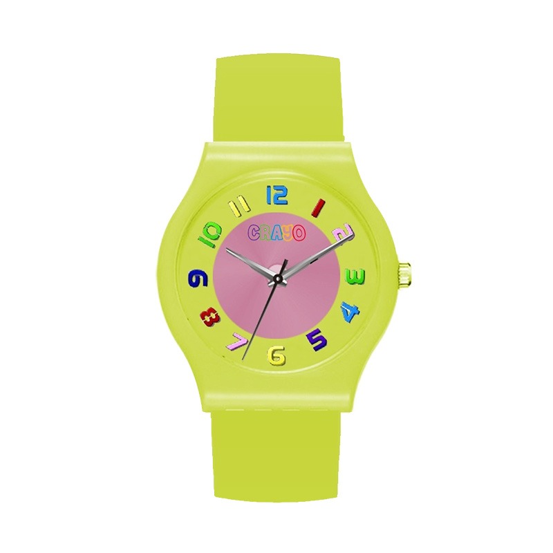 Yellow metal case with a yellow leatherette strap. Fixed yellow bezel. Multicolor dial with silver-tone hands and Arabic numeral hour markers. Dial Type: Analog. Quartz movement. Scratch resistant mineral crystal. Round case shape, case size: 36 mm, case thickness: 9 mm. Band width: 20 mm. Buckle clasp. Water resistant at 30 meters / 100 feet. Functions: hour, minute, second. Casual watch style. Watch label: Japan Movt. Crayo Jubilee Watch CRACR4604.