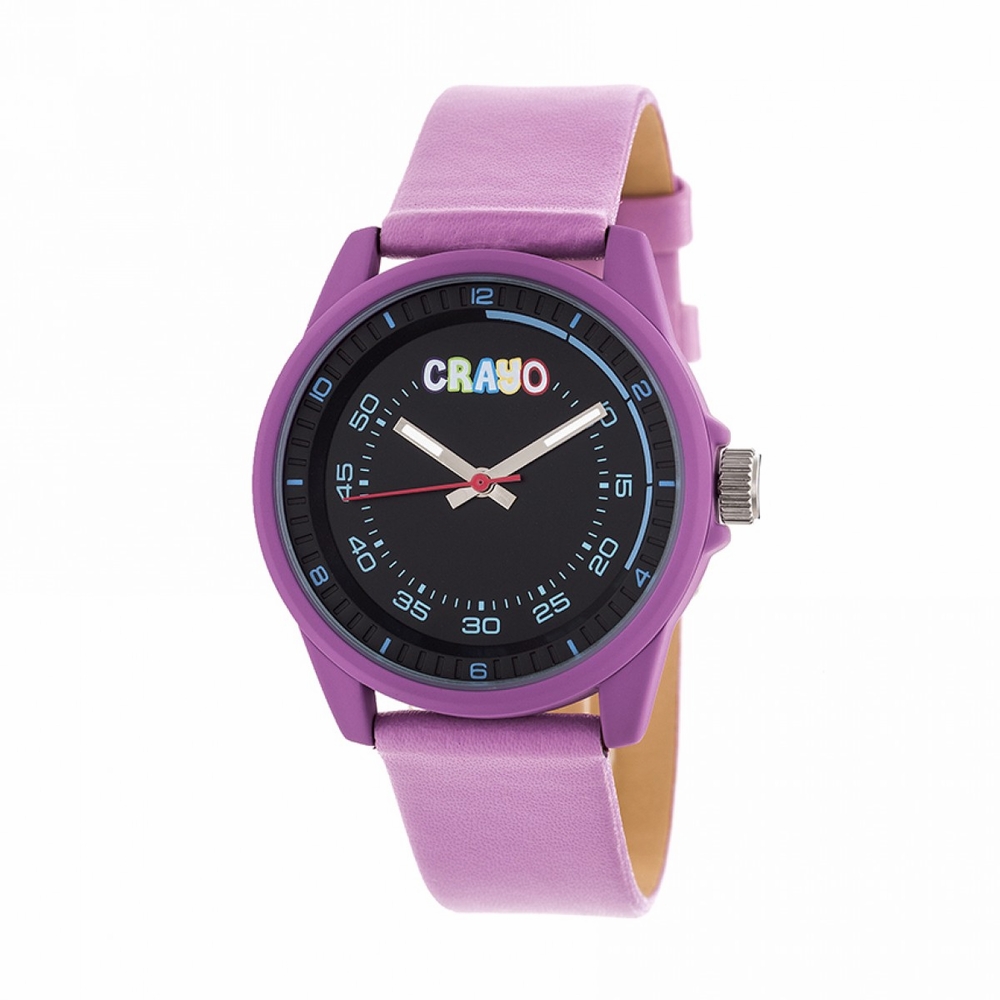 Light pink stainless steel case with a light pink leatherette strap. Fixed light pink metal bezel. Black dial with silver-tone hands and Arabic numeral hour markers. Minute scale around the inner rim. Dial Type: Analog. Luminescent hands. Quartz movement. Scratch resistant mineral crystal. Pull / push crown. Solid case back. Round case shape, case size: 34 mm, case thickness: 9 mm. Band width: 18 mm. Buckle clasp. Water resistant at 30 meters / 100 feet. Functions: hour, minute, second. Casual watch style. Watch label: Japan Movt. Crayo Jolt Black Dial Watch CRACR4905.