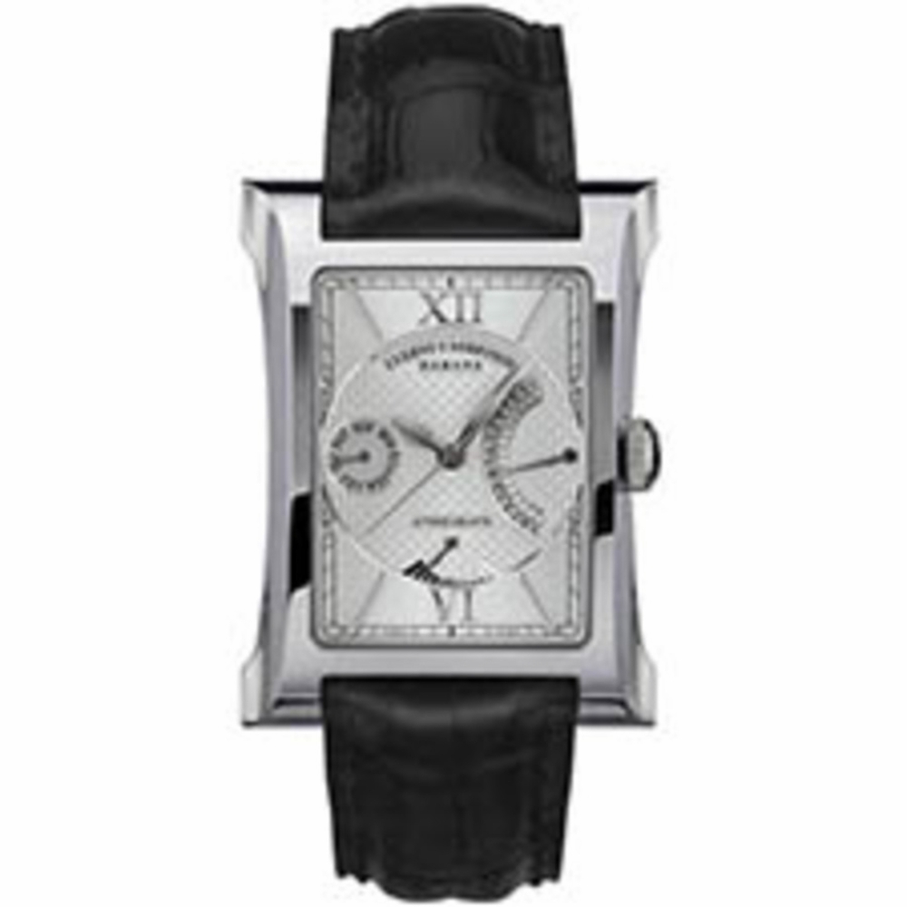 Stainless steel case with a black (alligator) leather strap. Fixed stainless steel bezel. Silver dial with silver-tone hands and index hour markers. Roman numerals appear at the 6 and 12 o'clock positions. Minute markers around the outer rim. Dial Type: Analog. Day of the week sub-dial. Retrograde date. Power reserve indicator. Automatic movement. Scratch resistant sapphire crystal. Pull / push crown. Transparent case back. Rectangle case shape. Case dimensions: 37 mm x 47 mm. Case thickness: 12.5 mm. Deployment clasp with a push button release. Water resistant at 30 meters / 100 feet. Functions: date, day, hour, minute, second, power reserve indicator. Esplendidos Series. Dress watch style. Watch label: Swiss Made. Cuervo Y Sobrinos Esplendidos Automatic Silver Dial Mens Watch 2452.1A.