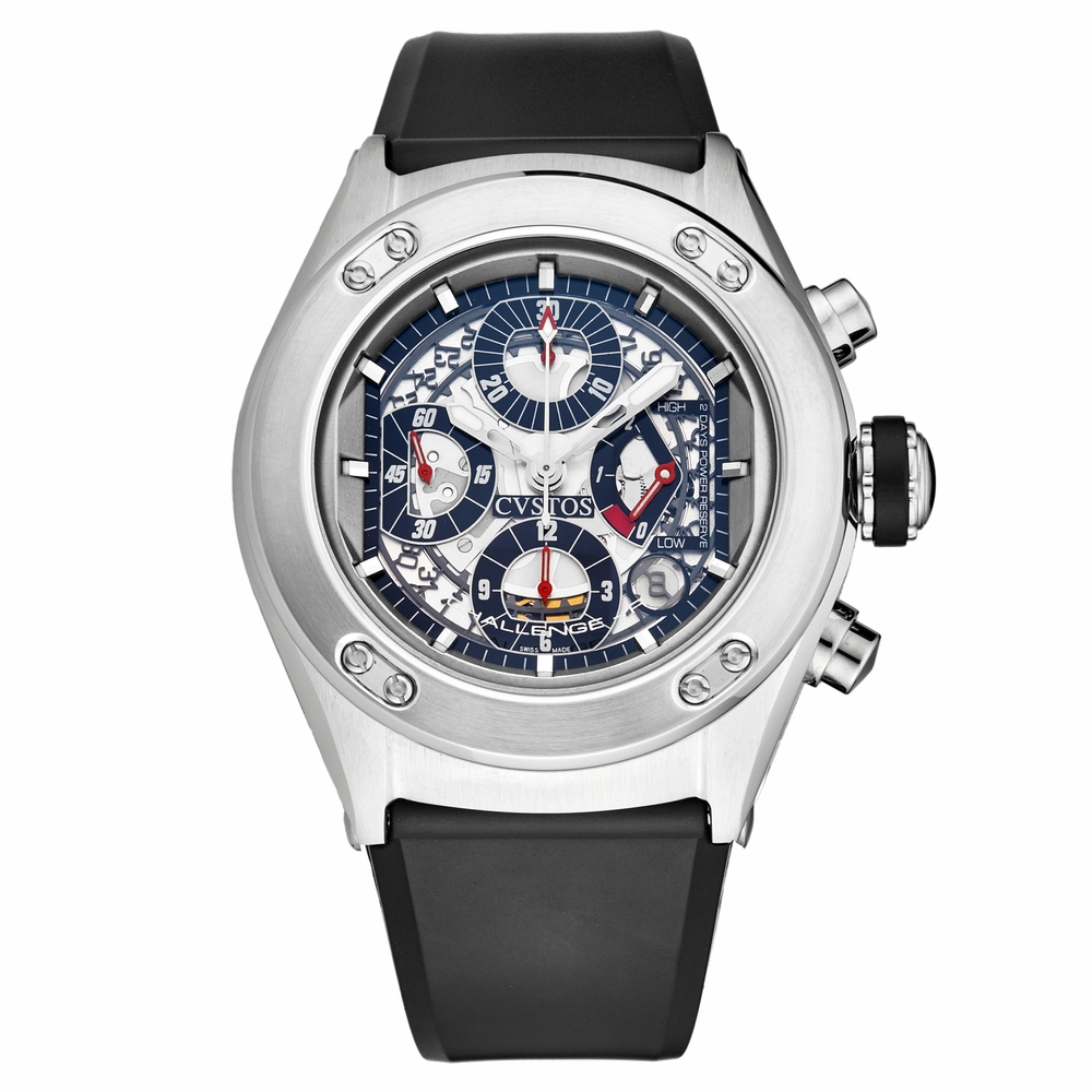 Silver-tone stainless steel case with a blue rubber strap. Fixed silver-tone stainless steel bezel. Blue smoked dial with silver-tone hands and index hour markers. Minute markers around the outer rim. Dial Type: Analog. Luminescent hands and markers. Date display between 4 and 5 o'clock position. Four sub-dials displaying: 60 second, 30 minute, 12 hour and power reserve indicator. Calibre CVSTOS 577 Automatic movement, based upon Valjoux 7750, containing 25 Jewels, bitting at 28800 vph, and has a power reserve of approximately 48 hours. Scratch resistant sapphire crystal. Screw down crown. Transparent case back. Round case shape, case size: 43 mm, case thickness: 15 mm. Band width: 25 mm, band length: 8 inches. Push button folding clasp. Water resistant at 100 meters / 330 feet. Functions: chronograph, date, hour, minute, second, power reserve indicator. Additional Info: black, smoked dial exclusive cvstos technology decoration. Challenger Series. Luxury watch style. Watch label: Swiss Made. Cvstos Challenge R Chronograph Automatic Blue Smoke Dial Mens Watch 4009R44AC 02.