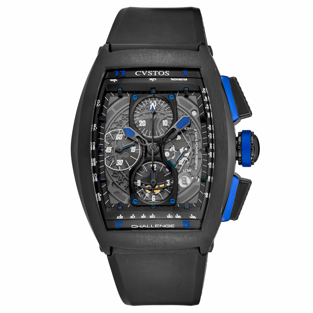 Black PVD stainless steel case with a black rubber strap. Fixed black PVD stainless steel bezel. Black skeletal dial with black hands and index hour markers. Minute markers around the outer rim. Dial Type: Analog. Luminescent hands and markers. Date display between 4 and 5 o'clock position. Four sub-dials displaying: 60 second, 30 min, 12 hour and power reserve indicator. Calibre CVSTOS 577 Automatic movement, based upon Valjoux 7750, containing 25 Jewels, bitting at 28800 vph, and has a power reserve of approximately 48 hours. Scratch resistant sapphire crystal. Screw down crown. Transparent case back. Tonneau case shape, case size: 41 mm, case thickness: 15 mm. Band width: 25 mm, band length: 8 inches. Push button folding clasp. Water resistant at 100 meters / 330 feet. Functions: chronograph, date, hour, minute, second. power reserve indicator, tachymeter. Challenge Gp Series. Luxury watch style. Watch label: Swiss Made. Cvstos Challenge GP Chronograph Automatic Black Skeletal Dial Mens Watch 8002CHGPACGB 01.