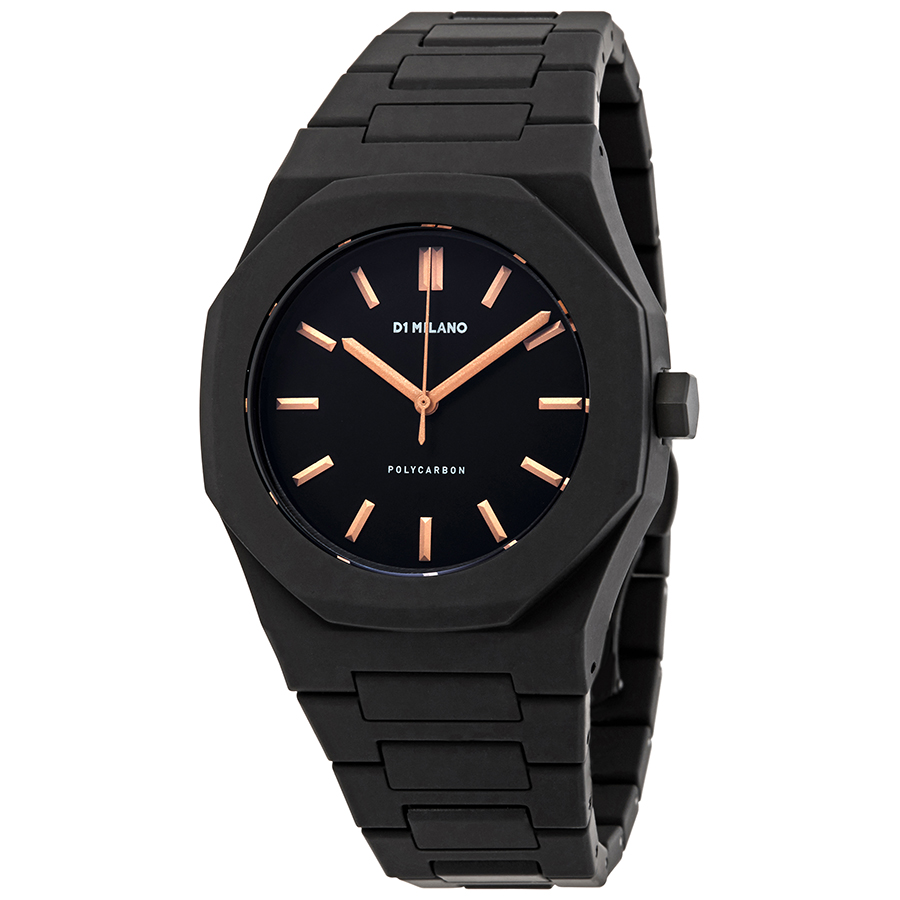 Black polycarbonate case with a black polycarbonate bracelet. Fixed black polycarbonate bezel. Black dial with rose gold-tone hands and index hour markers. Dial Type: Analog. Miyota Caliber 2036 quartz movement. Scratch resistant mineral crystal. Screw down crown. Solid case back. Octagonal case shape, case size: 40.5 mm, case thickness: 10.7 mm. Deployment clasp. Water resistant at 50 meters / 165 feet. Functions: hour, minute, second. Sport watch style. Watch label: Japan Movt. D1 Milano Polycarbon Black Dial Mens Watch PCBJ03.