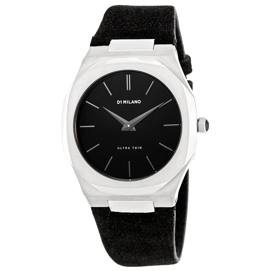 Stainless steel case with a black leather strap. Fixed stainless steel bezel. Black dial with gunmetal hands and index hour markers. Dial Type: Analog. Miyota Calibre GL20 quartz movement. Scratch resistant mineral crystal. Screw down crown. Solid case back. Octagonal case shape. Case size: 40 mm. Case thickness: 6 mm. Tang clasp. Water resistant at 50 meters / 165 feet. Functions: hour, minute. Casual watch style. Watch label: Japan Movt. D1 Milano Ultra Thin Black Dial Black Leather Mens Watch A-UT04.