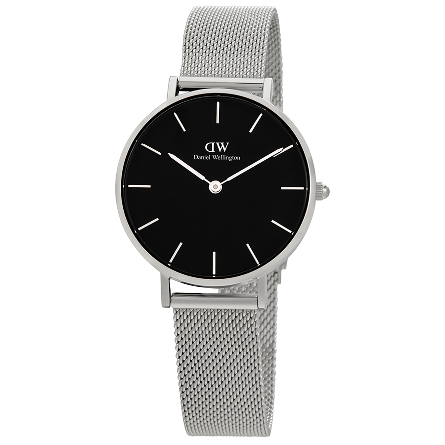Stainless steel case with a stainless steel mesh bracelet. Fixed stainless steel bezel. Black dial with silver-tone hands and index hour markers. Dial Type: Analog. Quartz movement. Scratch resistant mineral crystal. Pull / push crown. Solid case back. Round case shape. Case size: 32 mm. Case thickness: 6 mm. Band width: 14 mm, band length: 8 inches. Fold over slip through clasp. Water resistant at 30 meters / 100 feet. Functions: hour, minute. Classic Petite Sterling Series. Casual watch style. Daniel Wellington Classic Petite Sterling Black Dial Ladies Watch DW00100162.