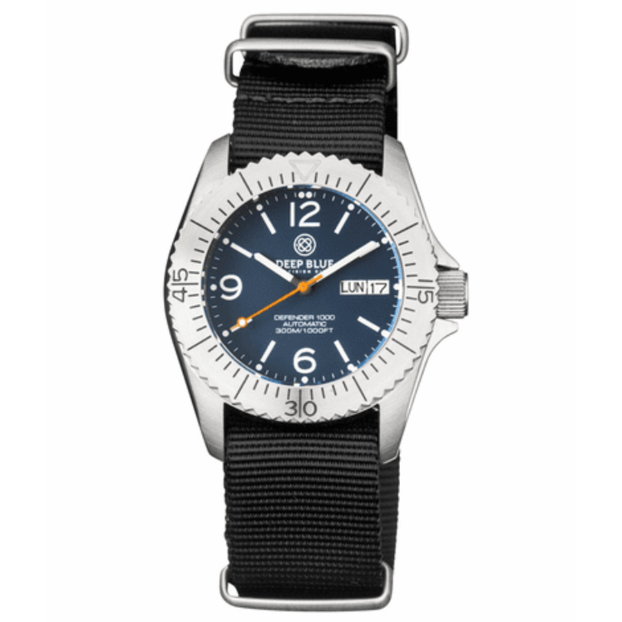 Silver-tone stainless steel case with a black nylon strap. Uni-directional rotating silver-tone aluminum bezel. Blue dial with silver-tone hands and index hour markers. Minute markers around the outer rim. Dial Type: Analog. Luminescent hands and markers. Day of the week and date display at the 3 o'clock position. Seiko Caliber NH36 Automatic movement, containing 24 Jewels, bitting at 21600 vph, and has a power reserve of approximately 41 hours. Scratch resistant sapphire crystal. Screw down crown. Transparent case back. Round case shape. Case size: 40 mm. Band width: 22 mm. Buckle clasp. Water resistant at 300 meters / 1000 feet. Functions: date, day, hour, minute, second. Dive watch style. Watch label: Japan Movt. Deep Blue Defender 1000 40Mm Automatic Blue Dial Unisex Watch DEFENDER40SSDARKBLUEMATTENATO.