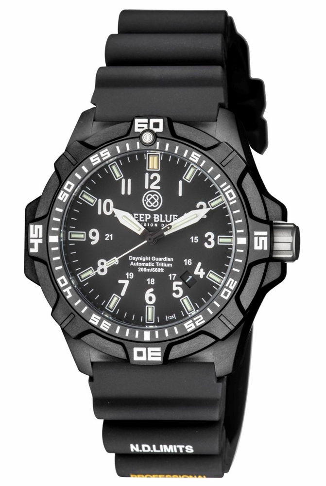 Black poly carbon case with a black rubber strap. Uni-directional rotating black bezel. Black dial with white hands and 13 tritium tubes hour markers. Minute markers around the outer rim. Dial Type: Analog. Luminescent hands and markers. Date display between 4 and 5 o'clock position. TMI Caliber NH35 automatic movement with a 41-hour power reserve. Scratch resistant mineral crystal. Pull / push crown. Round case shape, case size: 46 mm, case thickness: 13 mm. Band width: 24 mm, band length: 8 inches. Buckle clasp. Water resistant at 200m. Functions: date, hour, minute, second. Military watch style. Deep Blue DayNight Guardian Automatic Mens Watch.