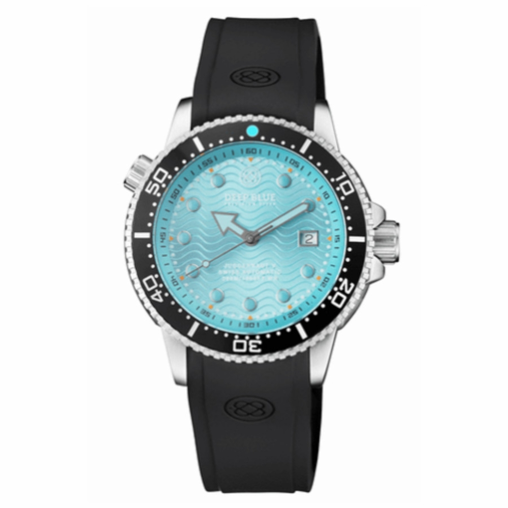 Silver-tone stainless steel case with a black silicone strap. Uni-directional rotating black ceramic bezel. Blue dial with black hands and index hour markers. Minute markers around the outer rim. Dial Type: Analog. Luminescent hands and markers. Date display at the 3 o'clock position. Sellita Caliber SW 200 Automatic movement, based upon ETA 2824-2, containing 26 Jewels, bitting at 28800 vph, and has a power reserve of approximately 38 hours. Scratch resistant sapphire crystal. Screw down crown. Transparent case back. Round case shape, case size: 44 mm, case thickness: 15 mm. Band width: 22 mm, band length: 8.5 inches. Buckle clasp. Water resistant at 300 meters / 1000 feet. Functions: date, hour, minute, second. Additional Info: unique juggernaut v light blue design. Juggernaut V Series. Dive watch style. Watch label: Swiss Made. Deep Blue Juggernaut V Automatic Blue Dial Mens Watch JUGGY5LIGHTBLUESTRAP.