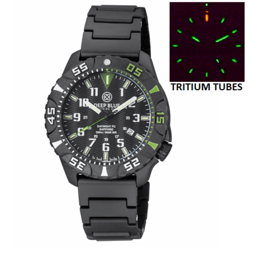 Black polycarbonate case with a black polycarbonate band. Black bezel. Black dial with silver-tone hands and index hour markers. Minute markers around the outer rim. Dial Type: Analog. Luminescent hands and markers. Date display at the 4 o'clock position. Swiss Made Ronda 515 Date Movement automatic movement. Scratch resistant sapphire crystal. Solid case back. Round case shape. Case size: 45 mm. Fold over clasp. Water resistant at 200 meters / 660 feet. Functions: date, hour, minute, second. Dive watch style. Watch label: Swiss Movt. Deep Blue Daynight Tritium Pc Quartz Diver Automatic Black Dial Unisex Watch DAYNIGHTPC2GREENBRACE.