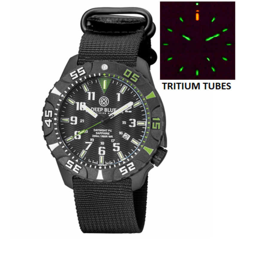 Black polycarbonate case with a black nylon strap. Black polycarbonate bezel. Black dial with silver-tone hands and index hour markers. Minute markers around the outer rim. Dial Type: Analog. Luminescent hands and markers. Date display at the 4 o'clock position. Swiss Made Ronda 515 Date Movement automatic movement. Scratch resistant sapphire crystal. Screw down crown. Solid case back. Round case shape. Case size: 45 mm. Water resistant at 200 meters / 660 feet. Functions: date, hour, minute, second. Dive watch style. Watch label: Swiss Movt. Deep Blue Daynight Tritium Pc Quartz Diver Automatic Black Dial Unisex Watch DAYNIGHTPC2GREENZULU.