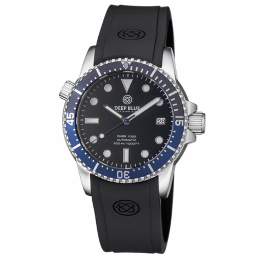 Silver-tone stainless steel case with a black silicone strap. Uni-directional rotating two-tone blue and black (Batman) aluminum bezel. Black dial with Breguet-style shape hands and index hour markers. Minute scale around the inner rim. Dial Type: Analog. Luminescent hands and markers. Date display at the 3 o'clock position. TMI Caliber NH35 automatic movement with a 41-hour power reserve. Scratch resistant sapphire crystal. Screw down crown. Solid case back. Round case shape, case size: 40 mm, case thickness: 15 mm. Band width: 22 mm, band length: 8.5 inches. Buckle clasp. Water resistant at 300 meters / 1000 feet. Functions: date, hour, minute, second. Dive watch style. Watch label: Japan Movt. Deep Blue Diver 40 Collection Automatic Black Dial Batman Bezel Watch DIVER40BATMAN.