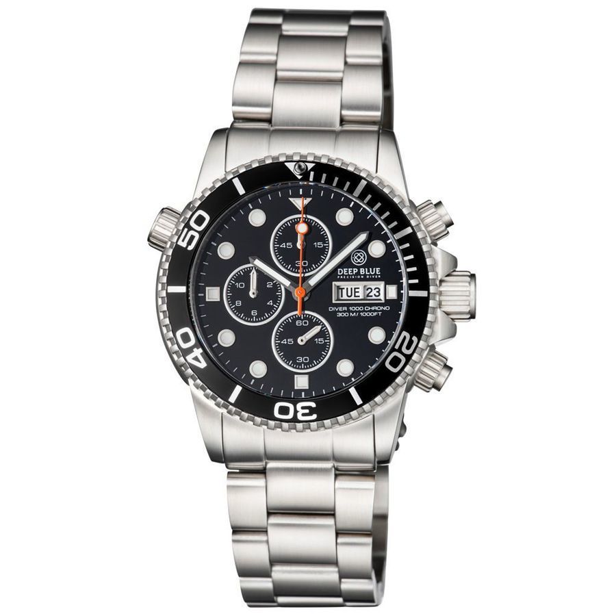 Stainless steel case with a stainless steel bracelet. Uni-directional rotating stainless steel bezel with a black aluminium ring. Black dial with luminous silver-tone hands and dot hour markers. Minute markers around the outer rim. Dial Type: Analog. Luminescent hands and markers. Day of the week and date display at the 3 o'clock position. Chronograph - three sub-dials displaying: 60 second, 60 minute and 12 hour. Miyota caliber OS00 quartz movement. Scratch resistant sapphire crystal. Screw down crown. Solid case back. Round case shape. Case size: 40 mm. Case thickness: 15 mm. Band width: 22 mm. Fold over clasp. Water resistant at 300 meters / 1000 feet. Functions: chronograph, date, day, hour, minute, second. Diver 1000 Quartz Chronograph Diver Series. Dive watch style. Watch label: Japan Movt. Deep Blue Diver 1000 Quartz Chronograph Diver Black Dial Unisex Watch DIVER40CHRONOBLKBLKBRAC.