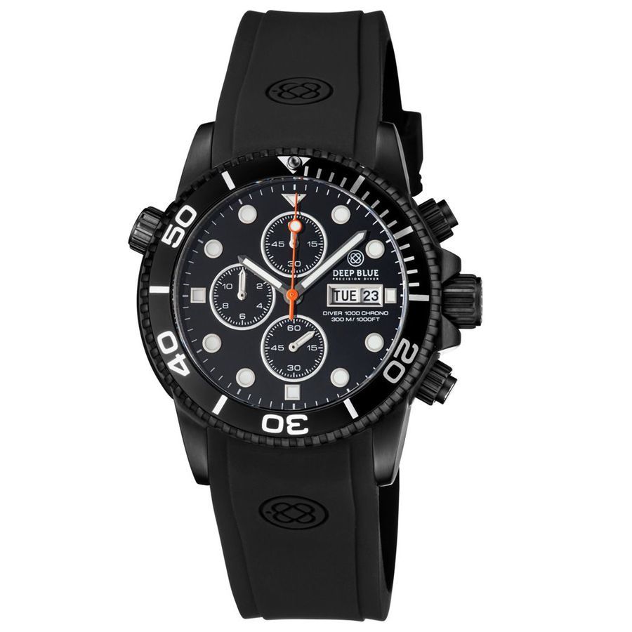 Black stainless steel case with a black silicone strap. Uni-directional rotating black aluminum bezel. Black dial with silver-tone hands and index hour markers. Minute markers around the outer rim. Dial Type: Analog. Luminescent hands and markers. Date display at the 3 o'clock position. Chronograph - sub-dials displaying: three - 60 minutes, 60 seconds, 12 hours. Caliber Miyota/Citizen quartz movement. Scratch resistant sapphire crystal. Screw down crown. Solid case back. Round case shape, case size: 40 mm, case thickness: 15 mm. Band width: 22 mm. Buckle clasp. Water resistant at 1000 meters / 3300 feet. Functions: date, day, hour, minute, second, chronograph. Dive watch style. Deep Blue Diver 1000 Quartz Chronograph Black Dial Unisex Watch DIVER40CHRONOPVD.