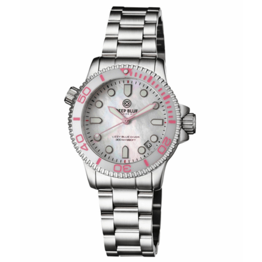 Silver-tone stainless steel case with a silver-tone stainless steel bracelet. Uni-directional rotating white aluminum bezel. Mother of pearl dial with pink hands and index hour markers. Minute markers around the outer rim. Dial Type: Analog. Luminescent hands and markers. Between the 4 and 5 o'clock position. Ronda Caliber 515 quartz movement. Scratch resistant sapphire crystal. Screw down crown. Solid case back. Round case shape, case size: 36 mm, case thickness: 13 mm. Band width: 18 mm. Deployment with push button release clasp. Water resistant at 300 meters / 1000 feet. Functions: date, hour, minute, second. Dive watch style. Watch label: Swiss Movt. Deep Blue Lizzy Blue Watch LIZBWHITEPINK9.