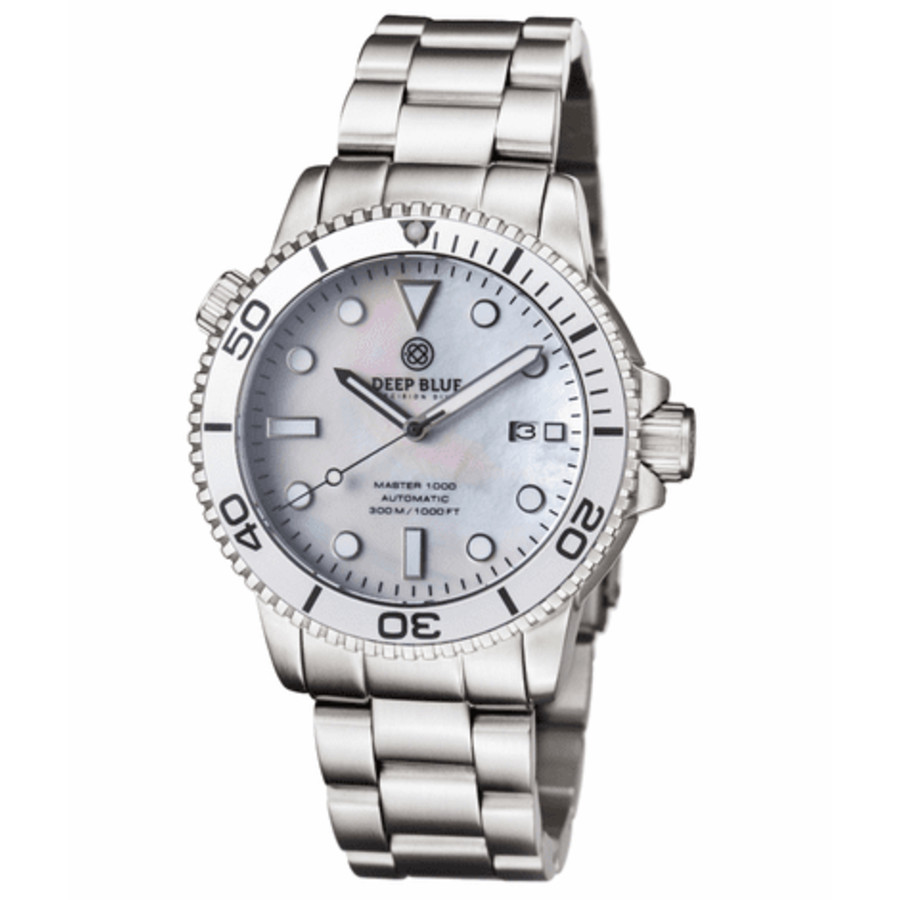 Silver-tone stainless steel case with a silver-tone stainless steel bracelet. Uni-directional rotating silver-tone stainless steel with a silver aluminium ring bezel. Mother of pearl dial with luminous silver-tone hands and dot hour markers. Minute markers around the outer rim. Dial Type: Analog. Luminescent hands and markers. Date display at the 3 o'clock position. TMI Caliber NH35 Automatic movement, containing 24 Jewels, bitting at 21600 vph, and has a power reserve of approximately 41 hours. Scratch resistant sapphire crystal. Screw down crown. Solid case back. Round case shape, case size: 44 mm, case thickness: 15 mm. Band width: 22 mm, band length: 8.5 inches. Deployment with push button release clasp. Water resistant at 300 meters / 1000 feet. Functions: date, hour, minute, second. Dive watch style. Watch label: Japan Movt. Deep Blue Master 1000 Automatic Watch MAS1KSILWHITEMOPBRACLET.