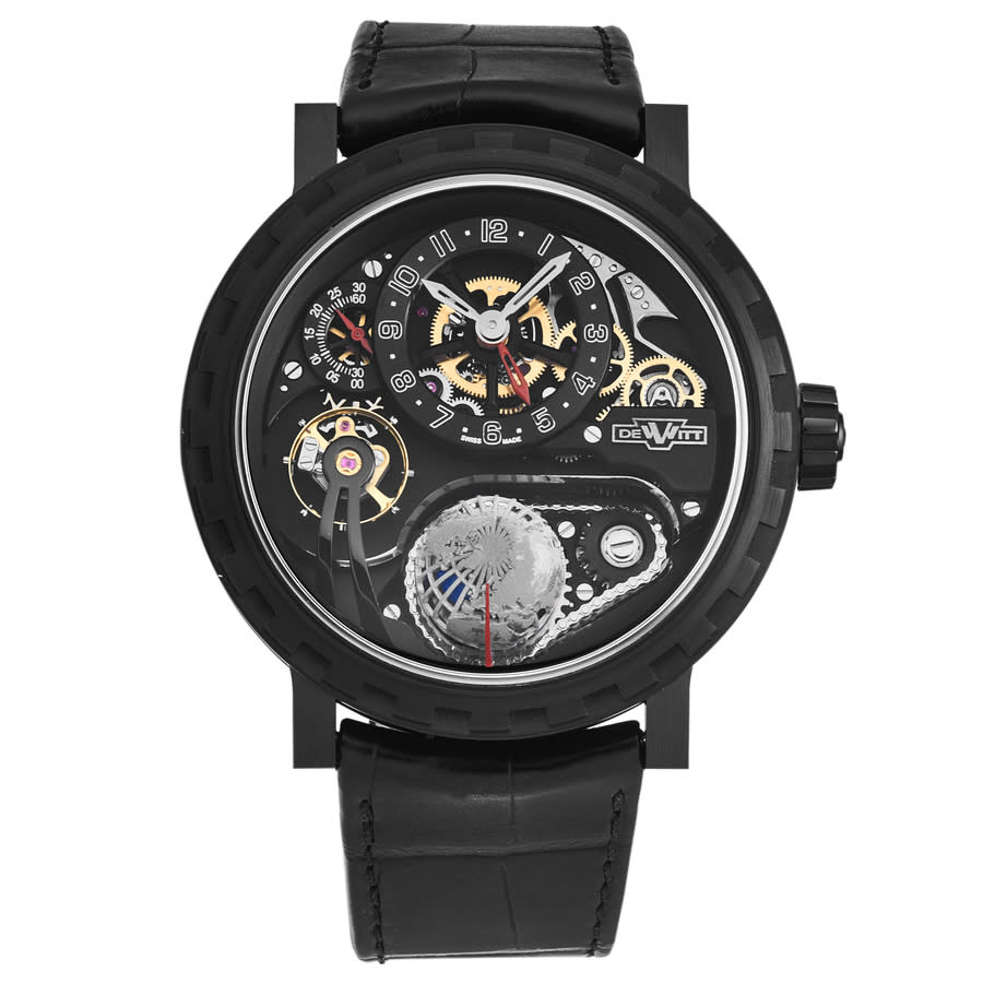 Black titanium case with a black leather strap. Fixed black titanium bezel. Black dial with silver-tone hands and Arabic numeral hour markers. Dial Type: Analog. Hand wind movement. Screw down crown. Transparent see through case back. Round case shape, case size: 46 mm. Buckle clasp. Functions: hour, minute, second. Academia Series. Luxury watch style. DeWitt Academia Hand Wind Black Dial Mens Watch AC.GMT.002.