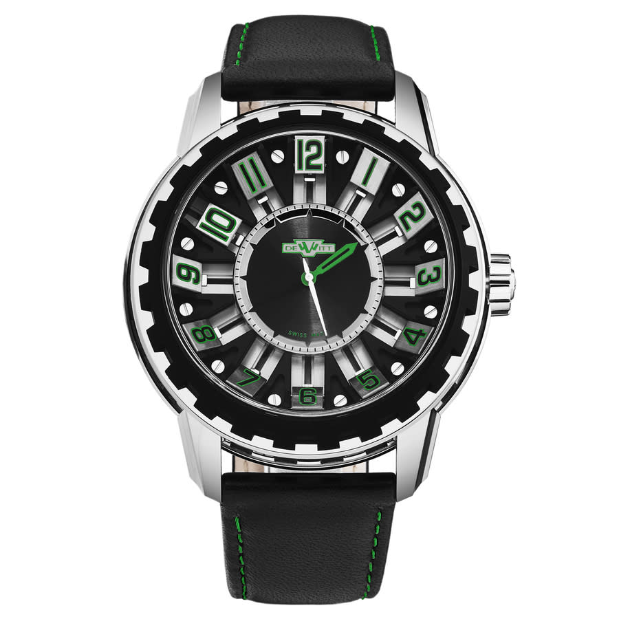Titanium case with a black leather strap. Fixed black titanium bezel. Black dial with green hands and Arabic numeral hour markers. Minute scale around the inner rim. Dial Type: Analog. Automatic movement. Scratch resistant sapphire crystal. Pull / push crown. Transparent case back. Round case shape, case size: 49.2 mm, case thickness: 15.3 mm. Band width: 23 mm, band length: 8 inches. Fold over clasp. Water resistant at 30 meters / 100 feet. Functions: hour, minute, second. Additional Info: 3D hours, minutes, seconds. Academia Series. Luxury watch style. DeWitt Academia Automatic Black Dial Mens Watch AC.SLD.002 RPB.