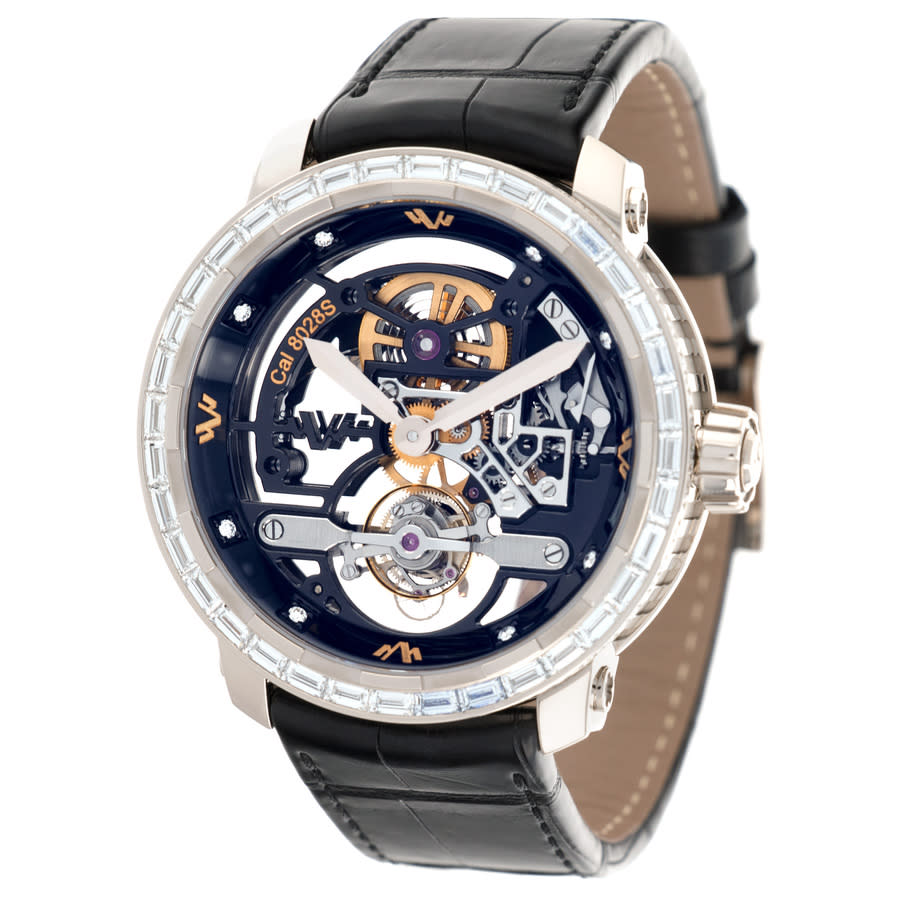 18kt white gold case with a black crocodile leather strap. Fixed 18kt white gold bezel with diamond set. White dial with white hands and diamond hour markers. Dial Type: Analog. One subdial displaying: tourbillon. DeWitt Calibre DW8028S Hand Wind movement, containing 19 Jewels, composed of 185 parts, bitting at 18000 vph, and has a power reserve of approximately 72 hours. Scratch resistant sapphire crystal. Screw down crown. Transparent case back. Round case shape, case size: 43 mm. Tang clasp. Water resistant at 30 meters / 100 feet. Functions: tourbillon, hour, minute. Additional Info: limited to 28 pieces. Twenty-8-eight Series. Luxury watch style. Watch label: Swiss Made. DeWitt Twenty-8-Eight Tourbillon Hand Wind Diamond White Dial Mens Watch T8.RH.009A.