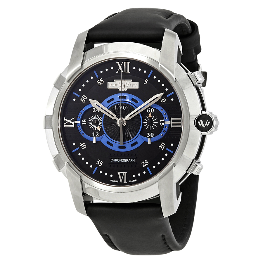 Silver-tone stainless steel case with a black rubber strap. Fixed silver-tone stainless steel bezel. Black dial with silver-tone hands and Roman and Arabic numeral hour markers. Minute markers around the outer rim. Dial Type: Analog. Chronograph - three sub-dials displaying: 60 minutes, 60 seconds, 24 hours. Automatic movement with a 42-hour power reserve. Scratch resistant sapphire crystal. Pull / push crown. Solid case back. Round case shape, case size: 46 mm. Deployment clasp. Water resistant at 30 meters / 100 feet. Functions: chronograph, hour, minute, second. Glorious knight series. Luxury watch style. Watch label: Swiss Made. DeWitt Glorious Knight Chronograph Automatic Black Dial Mens Watch FTV.CHR.007.RFB.
