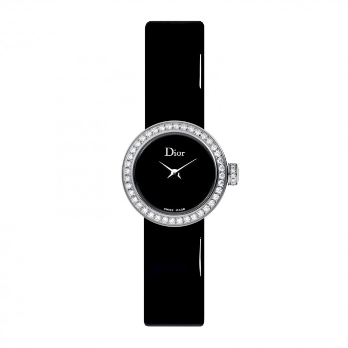 Stainless steel case with a black leather strap. Fixed stainless steel bezel set with diamonds. Black dial with silver-tone hands. No markers. Dial Type: Analog. Quartz movement. Scratch resistant sapphire crystal. Pull / push crown. Solid case back. Round case shape. Case size: 19 mm. Tang clasp. Water resistant at 30 meters / 100 feet. Functions: hour, minute. La Mini D De Dior Series. Luxury watch style. Watch label: Swiss Made. Dior La Mini D de Dior Quartz Black Dial Ladies Watch CD040110A012.