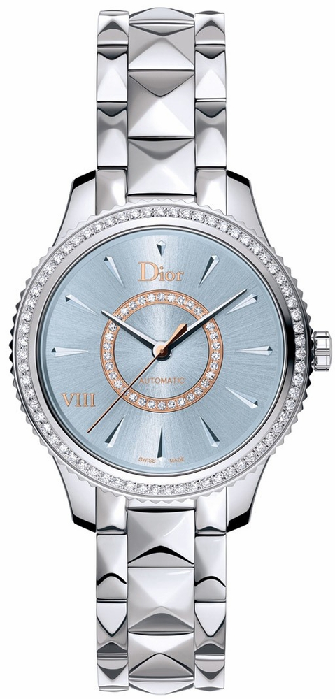 Silver-tone polished stainless steel case with a silver-tone polished stainless steel bracelet. Fixed silver-tone bezel with diamond set. Blue- diamonds dial with silver-tone hands and index-Roman numeral hour markers. Diamond set around the inner rim. Dial Type: Analog. Automatic movement. Scratch resistant sapphire crystal. Pull / push crown. Solid case back. Round case shape, case size: 32 mm. Water resistant at 50 meters / 165 feet. Functions: hour, minute, second. Montaigne Series. Dress watch style. Watch label: Swiss Made. Dior Montaigne Automatic Blue- Diamond Dial Ladies Watch CD152510M001.