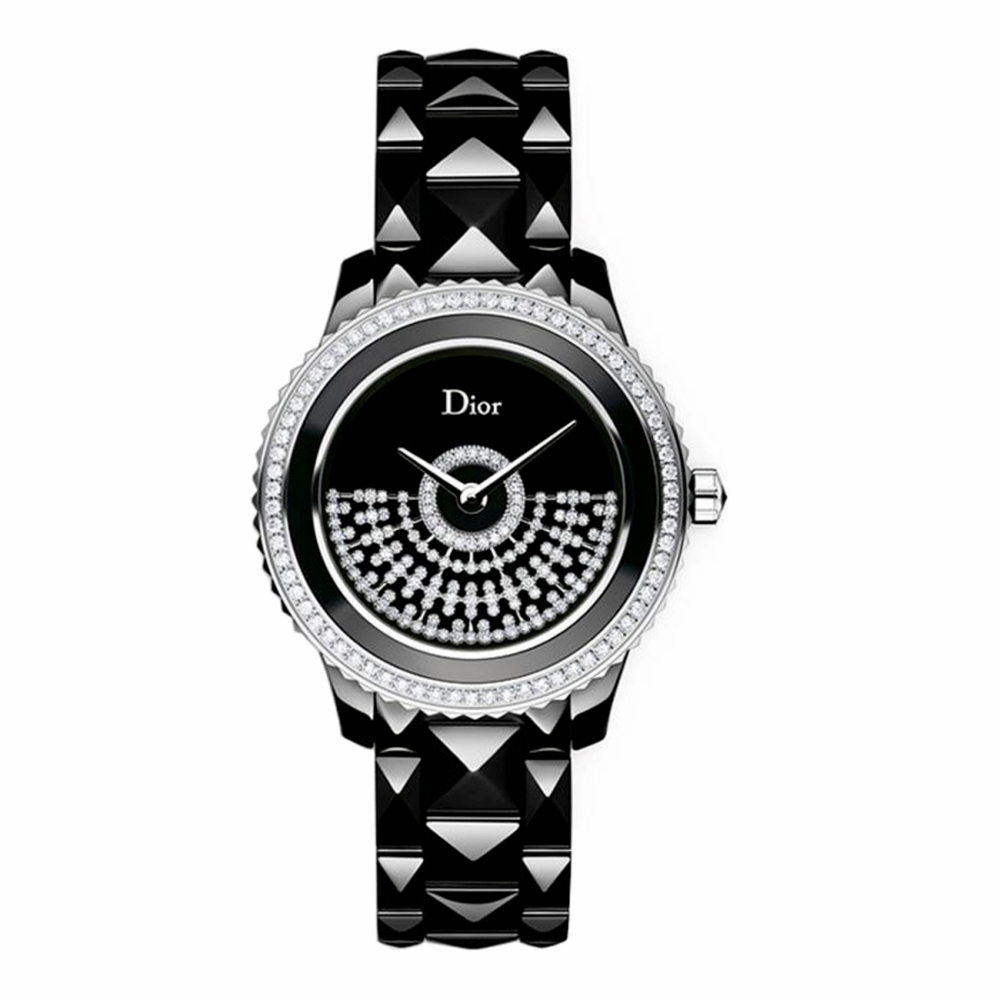 Black ceramic case and bracelet. Fixed bezel. Black dial with silver-tone hands. Dial Type: Analog. Automatic movement. Scratch resistant sapphire crystal. Pull / push crown. Transparent see through case back. Round case shape, case size: 33 mm. Deployment clasp. Water resistant at 50 meters / 165 feet. Functions: hour, minute. Additional Info: 211 / carat (approx.): 0.8 / clarity: v.v.s. Viii Series. Watch label: Swiss Made. Dior VIII Automatic Black Dial Ladies Watch CD123BE0C001.