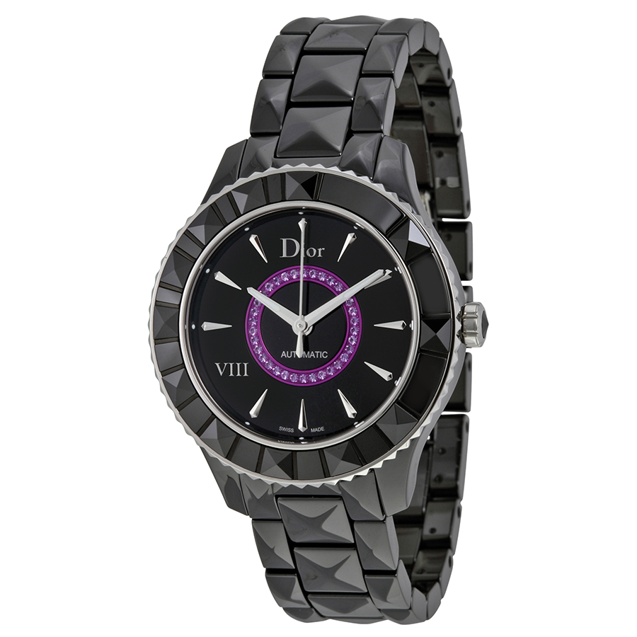 Black ceramic case with a black ceramic bracelet. Uni-directional rotating stainless steel bezel with black ceramic inserts. Black (lacquered amethyst-set) dial with luminous silver-tone hands and index hour markers. A Roman numeral appears at the 8 o'clock position. Dial Type: Analog. Automatic movement with a 38-hour power reserve. Scratch resistant sapphire crystal. Pull / push crown. Transparent case back. Round case shape. Case size: 38 mm. Case thickness: 10.3 mm. Band width: 15 mm. Band length: 8 inches. Deployment clasp with a push button release. Water resistant at 50 meters / 165 feet. Functions: hour, minute, second. Luxury watch style. Watch label: Swiss Made. Dior VIII Black Dial Black Ceramic Ladies Watch CD1245E7C001.