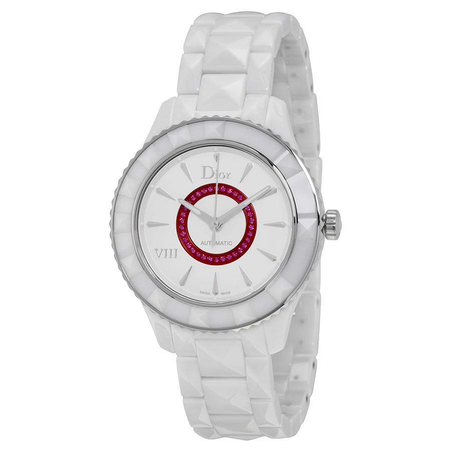 White ceramic case with a white ceramic bracelet. Uni-directional rotating stainless steel bezel with white ceramic inserts. White dial (set with red rubies) with luminous silver-tone hands and index hour markers. A Roman numeral appears at the 8 o'clock position. Dial Type: Analog. Luminescent hands and markers. Automatic movement with a 38-hour power reserve. Scratch resistant sapphire crystal. Pull / push crown. Transparent case back. Round case shape. Case size: 38 mm. Case thickness: 10.3 mm. Band width: 15 mm. Fold over clasp. Water resistant at 50 meters / 165 feet. Functions: hour, minute, second. Casual watch style. Watch label: Swiss Made.Dior VIII Automatic 38mm White Dial Ceramic Ladies Watch CD1245E8C00