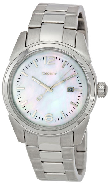 Stainless steel case with a stainless steel bracelet. Fixed stainless steel bezel. Mother of pearl dial with silver-tone hands and stick hour markers. Arabic numerals mark the 6 and 12 o'clock positions. Minute markers around the outer rim. Date display at the 3 o'clock position. Quartz movement. Scratch resistant mineral crystal. Case diameter: 36 mm. Case thickness: 13 mm. Deployment clasp. Water resistant at 50 meters / 165 feet. AdditionalInfo: date calendar at 3. DKNY Analog Womens Watch NY1394.