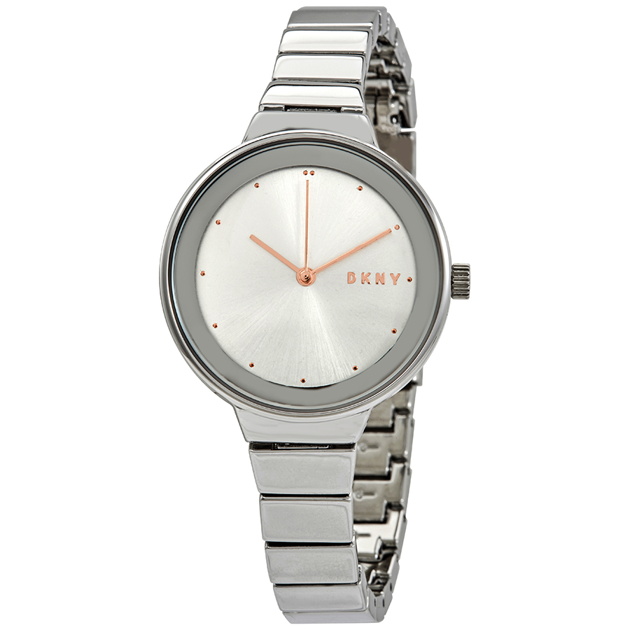 Stainless steel case with a stainless steel bracelet. Fixed stainless steel bezel. Silver dial with rose gold-tone hands and dot hour markers. Dial Type: Analog. Quartz movement. Scratch resistant mineral crystal. Pull / push crown. Solid case back. Round case shape. Case size: 32 mm. Case thickness: 8 mm. Band width: 12 mm. Fold over clasp. Water resistant at 30 meters / 100 feet. Functions: hour, minute, second. Casual watch style. Watch label: Japan Movt. DKNY Astoria Quartz Silver Dial Stainless Steel Ladies Watch NY2694.