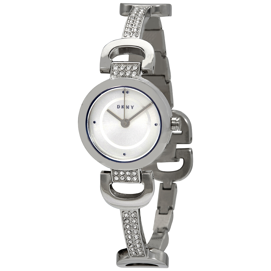 Stainless steel case with a stainless steel bezel set with crystals. Fixed stainless steel bezel. Silver dial with silver-tone hands. Dot markers at the 3, 6, 9 and 12 o'clock positions. Dial Type: Analog. Quartz movement. Scratch resistant mineral crystal. Pull / push crown. Solid case back. Round case shape. Case size: 24 mm. Case thickness: 7 mm. Jewelry clasp. Water resistant at 30 meters / 100 feet. Functions: hour, minute, second. Casual watch style. Watch label: Japan Movt. DKNY City Link Quartz Silver Dial Ladies Watch NY2751.