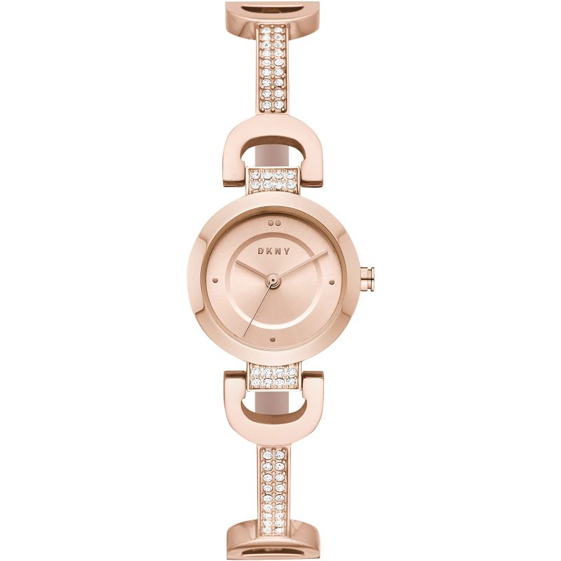 Rose gold-tone stainless steel case with a rose gold-tone stainless steel bracelet set with crystals. Fixed rose gold-tone bezel. Rose dial with rose gold-tone hands. Dot markers appear at the 3, 6, 9 and 12 o'clock positions. Dial Type: Analog. Quartz movement. Scratch resistant mineral crystal. Pull / push crown. Solid case back. Round case shape. Case size: 24 mm. Case thickness: 7 mm. Band width: 5 mm. Deployment clasp. Water resistant at 50 meters / 165 feet. Functions: hour, minute, second. City Series. Casual watch style. DKNY City Quartz Rose Dial Rose Gold-tone Ladies Watch NY2752.