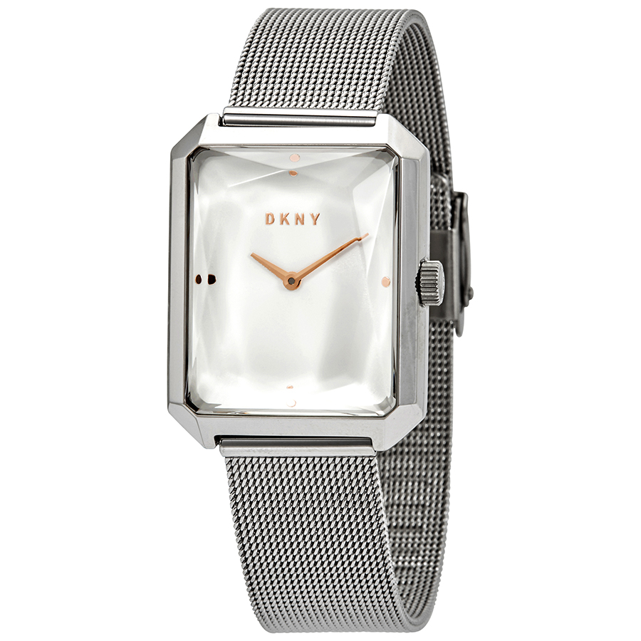 Stainless steel case with a stainless steel mesh bracelet. Fixed stainless steel bezel. Silver dial with rose gold-tone hands. Dot markers at the 3, 6, 9 and 12 o'clock positions. Dial Type: Analog. Quartz movement. Scratch resistant mineral crystal. Pull / push crown. Solid case back. Rectangle case shape. Case dimensions: 27 mm x 34 mm. Case thickness: 6 mm. Band width: 16 mm. Safety mesh clasp. Water resistant at 50 meters / 165 feet. Functions: hour, minute, second. Casual watch style. DKNY Cityspire Quartz Silver Rectangle Dial Ladies Watch NY2708.