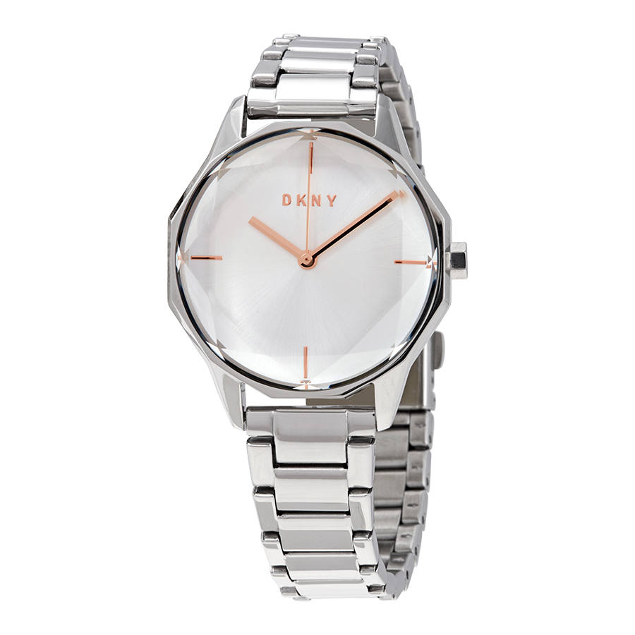 Stainless steel case with a stainless steel bracelet. Fixed stainless steel bezel. Silver dial with rose gold-tone hands. Index markers at the 3, 6, 9 and 12 o'clock positions. Dial Type: Analog. Quartz movement. Scratch resistant mineral crystal. Pull / push crown. Solid case back. Round case shape. Case size: 34 mm. Case thickness: 10 mm. Band width: 16 mm. Fold over clasp with a push button release. Water resistant at 50 meters / 165 feet. Functions: hour, minute, second. Casual watch style. Watch label: Japan Movt. DKNY Cityspire Quartz Silver Dial Stainless Steel Ladies Watch NY2793.