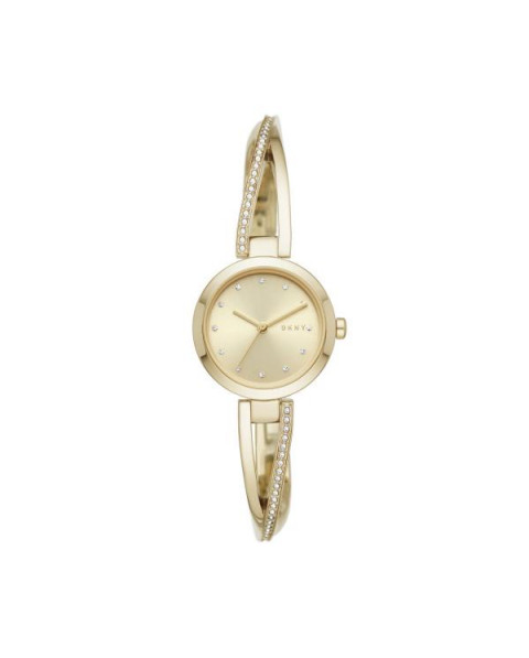 Yellow gold-tone stainless steel case with a yellow gold-tone stainless steel bracelet set with crystals. Fixed yellow gold-tone bezel. Gold-tone dial with yellow gold-tone hands and crystal hour markers. Dial Type: Analog. Quartz movement. Scratch resistant mineral crystal. Pull / push crown. Solid case back. Round case shape. Case size: 26 mm. Case thickness: 8 mm. Band width: 10 mm. Jewelry (adjust o matic) clasp. Water resistant at 50 meters / 165 feet. Functions: hour, minute, second. Crosswalk Series. Dress watch style. DKNY Crosswalk Quartz Crystal Gold Dial Ladies Watch NY2830.