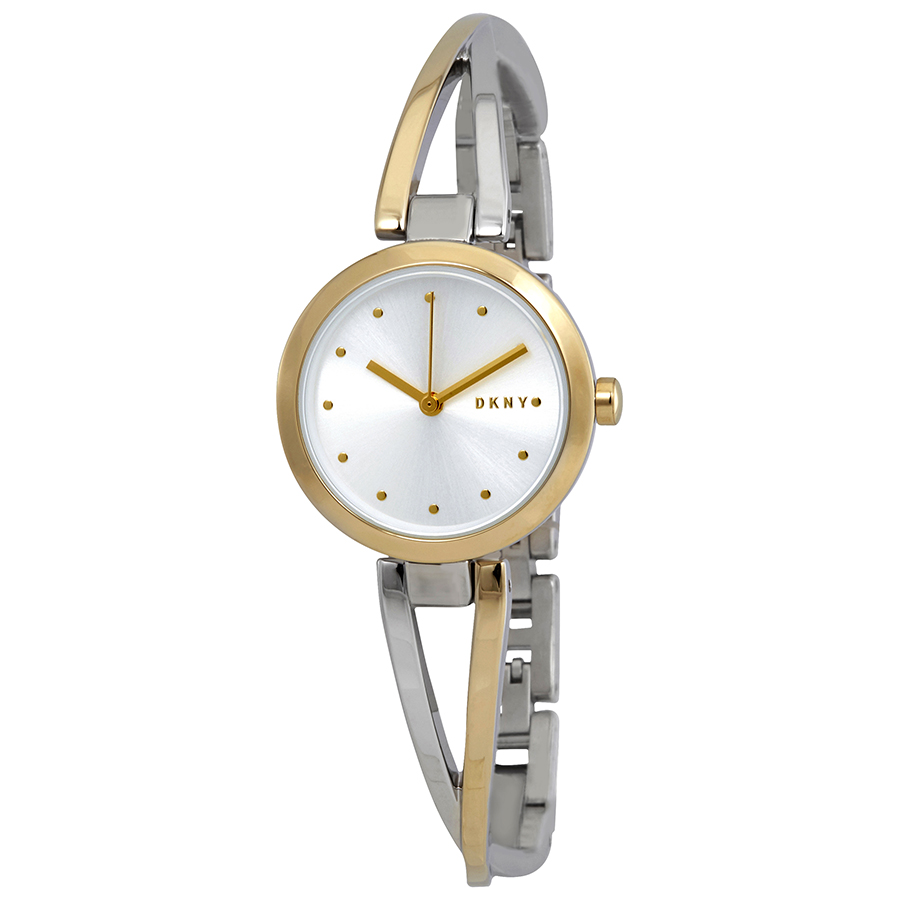 Gold-tone stainless steel case with a two-tone (silver-tone and gold-tone) stainless steel bracelet. Fixed gold-tone bezel. Silver dial with gold-tone hands and dot hour markers. Dial Type: Analog. Quartz movement. Scratch resistant mineral crystal. Pull / push crown. Solid case back. Round case shape. Case size: 26 mm. Case thickness: 8 mm. Band width: 10 mm. Jewelry clasp. Water resistant at 50 meters / 165 feet. Functions: hour, minute, second. Casual watch style. DKNY Crosswalk Quartz Silver Dial Two-tone Ladies Watch NY2790.