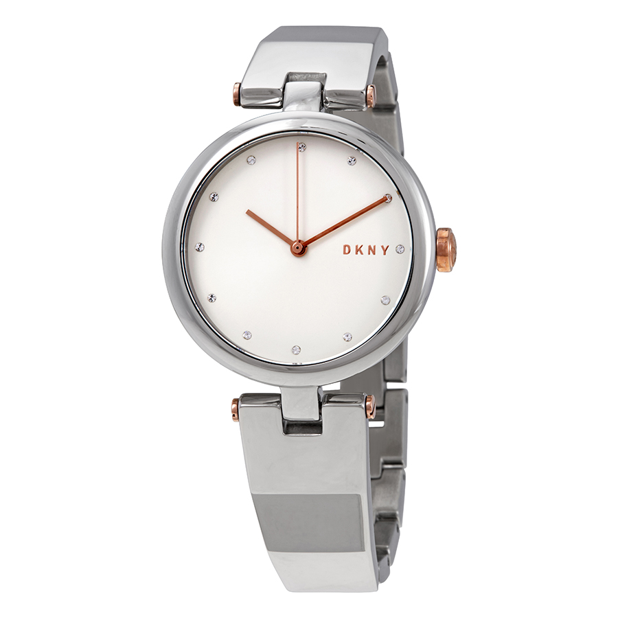 Stainless steel case with a stainless steel bracelet. Fixed stainless steel bezel. Silver dial with rose gold-tone hands and crystal hour markers. Dial Type: Analog. Quartz movement. Scratch resistant mineral crystal. Pull / push crown. Solid case back. Round case shape. Case size: 34 mm. Case thickness: 8 mm. Band width: 16 mm. Jewelry clasp. Water resistant at 50 meters / 165 feet. Functions: hour, minute, second. Casual watch style. DKNY Eastside Quartz Silver Dial Stainless Steel Ladies Watch NY2745.