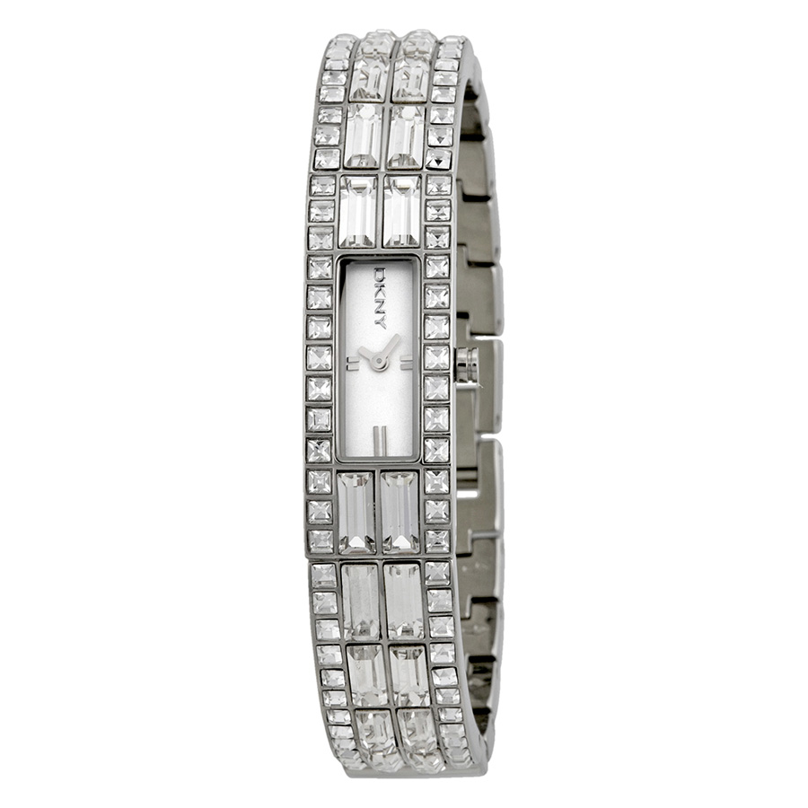 Stainless steel case with a stainless steel bracelet set with baguette crystals. Fixed stainless steel bezel set with baguette crystals. White dial with silver-toned hands and index hour markers. Dial Type: Analog. Quartz movement. Scratch resistant mineral crystal. Pull / push crown. Solid case back. Case dimensions: 13 mm x 25 mm. Case thickness: 8 mm. Rectangle case shape. Jewelry clasp. Water resistant at 30 meters / 100 feet. Functions: hour, minute. Additional Info: swarovski crystals. Fashion watch style. DKNY Ladies Dress Watch NY3715.