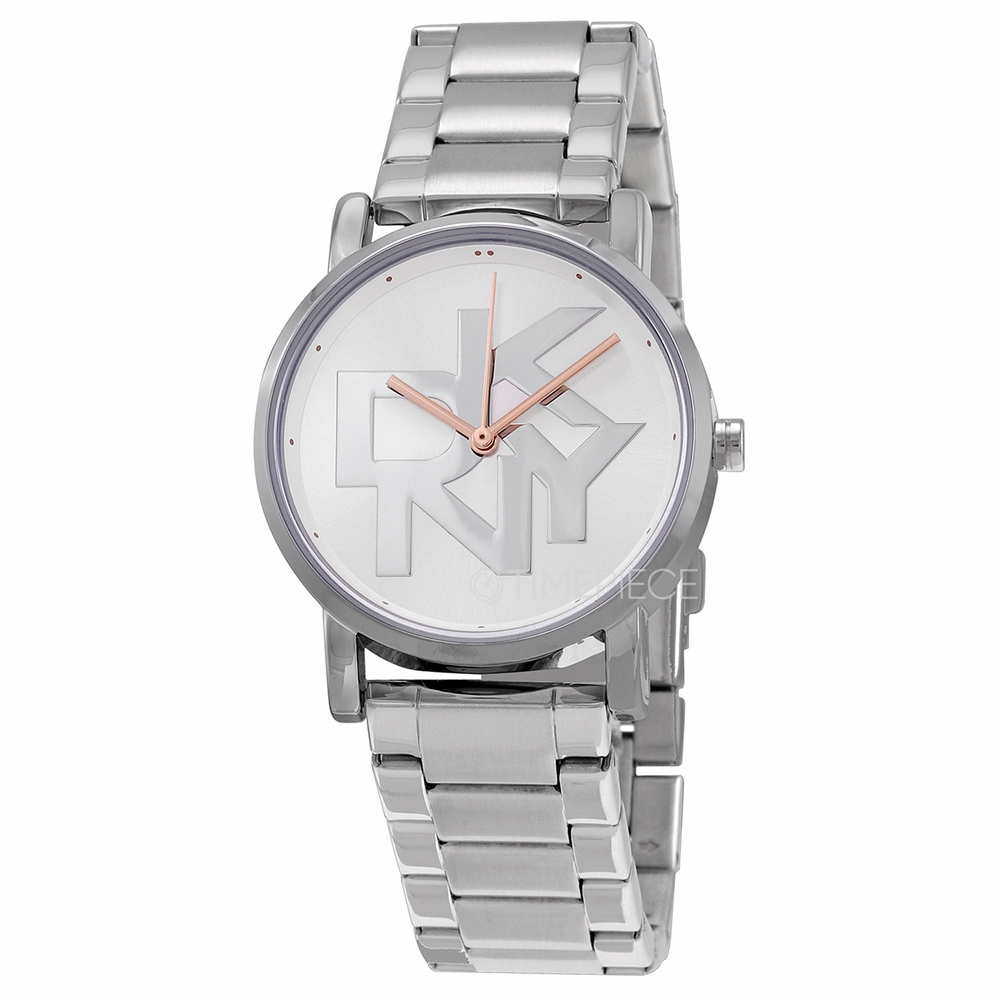 Stainless steel case with a 1 stainless steel bracelet. Fixed stainless steel bezel. Silver dial with rose gold-tone hands. Dial Type: Analog. Quartz movement. Scratch resistant mineral crystal. Push / pull crown. Solid case back. Round case shape. Case size: 34 mm. Case thickness: 9 mm. Band width: 18 mm. Fold over clasp with a push button release. Water resistant at 30 meters / 100 feet. Functions: hour, minute, second. Soho Series. Dress watch style. DKNY Soho Quartz Silver Dial Ladies Watch NY2957.
