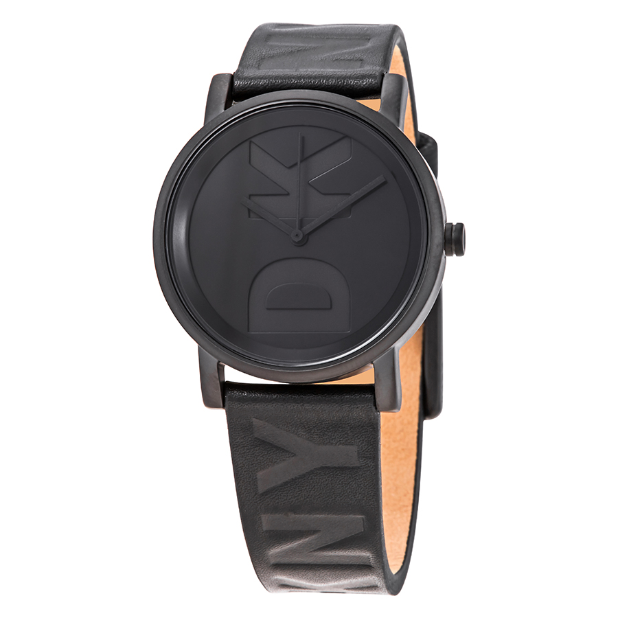 Black ion-plated stainless steel case with a black leather strap. Fixed black ion-plated bezel. Black dial with black hands. No markers. Dial Type: Analog. Quartz movement. Scratch resistant mineral crystal. Pull / push crown. Solid case back. Round case shape. Case size: 34 mm. Case thickness: 9 mm. Band width: 14 mm. Tang clasp. Water resistant at 50 meters / 165 feet. Functions: hour, minute, second. Casual watch style. DKNY Soho Quartz Black Dial Black Leather Ladies Watch NY2783.