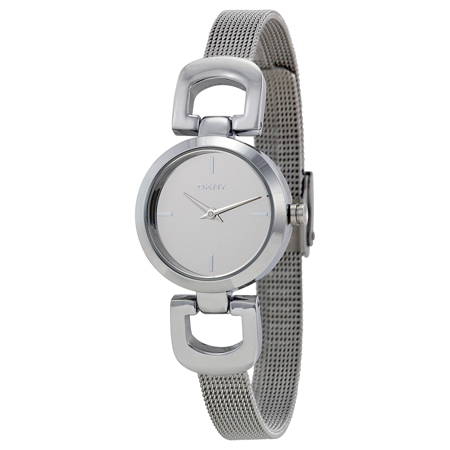 Stainless steel case with a stainless steel mesh bracelet. Fixed stainless steel bezel. Silver mirror dial with silver-tone hands. Index markers at the 3, 6, 9 annd 12 o'clock positions. Dial Type: Analog. Quartz movement. Scratch resistant mineral crystal. Pull / push crown. Solid case back. Case diameter: 24 mm. Case thickness: 7 mm. Round case shape. Band width: 5 mm. Fold over clasp. Water resistant at 30 meters / 100 feet. Functions: hour, minute, second. Casual watch style. DKNY Silver Dial Stainless Steel Mesh Bracelet Ladies Watch NY2100.