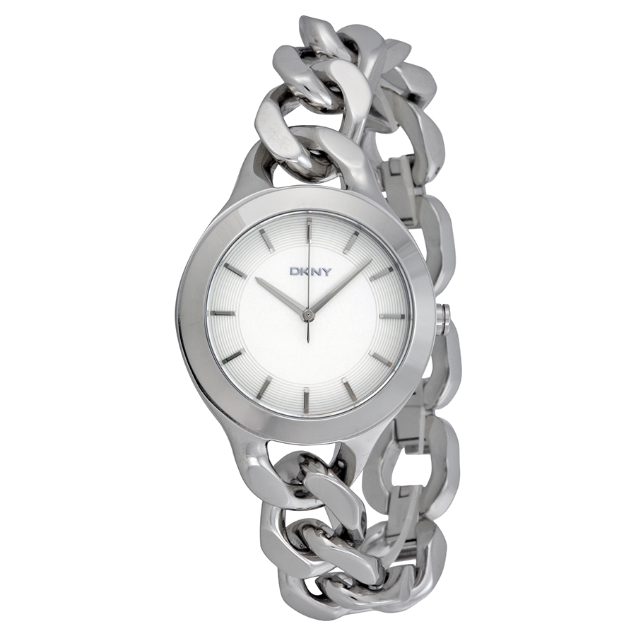 Stainless steel case with a stainless steel chain-link bracelet. Fixed stainless steel bezel. White pearlized dial with silver-tone hands and index hour markers. Dial Type: Analog. Quartz movement. Scratch resistant mineral crystal. Pull / push crown. Solid case back. Case diameter: 24 mm. Case thickness: 9 mm. Round case shape. Band width: 6.5 mm. Jewelry clasp. Water resistant at 50 meters / 165 feet. Functions: hour, minute, second. Casual watch style. DKNY Chambers White Pearlized Dial Stainless Steel Ladies Watch NY2216.